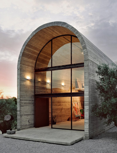 art warehouse in boeotia by greek A31 architecture is situated amongst olive, oleander and cypress trees, on a 4000 m2 plot and a few meters away from painter and sculptor alexandros liapis dwelling in dilesi, boeotia. a part of the landscape was incorporated in the open-space sculpture gallery, hosting the artist’s creations. the basic criteria of the new structure’s synthesis was: the economy of its realization means, its construction honesty and discipline, its plasticity which would converse with the spirit of the greek landscape.