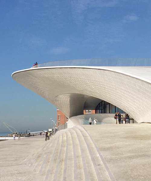 MAAT explores contemporary culture through visual arts, new media, architecture, technology, and science. the new building allows visitors to walk over, under, and through the museum complex, with a waterfront promenade leading to an elevated roof terrace. from here, sweeping views are afforded towards the river, the 25 de abril bridge suspension bridge, and the city’s christ the king monument. the scheme seeks to restore the historic connection between the city and the water. steps lead down into the river, covered with water at high tide, creating a constantly changing environment. above, an overhanging façade covered in 15,000 3D tiles is a reference to portugal’s rich tradition of ceramics.