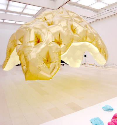 inflated golden balloon hanging from ceiling image © designboom