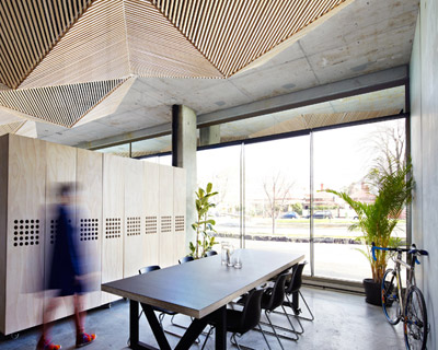 the highlight feature of the new assemble studio is its geometric ceiling, comprised of triangular, origami-like folds of timber battens. located in melbourne, the studio was designed by australian architecture and design firm assemble with the help of local organizations. the aim of the new fit-out is to reflect the company’s strong design ethos in its work.
