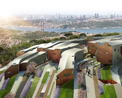 the project sits like a ring placed over the terrain, with its funnel-like roof forming a shaded perimeter walkway and an introverted core.