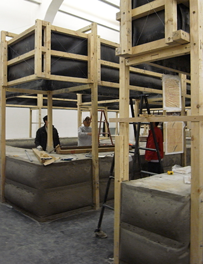 the rubber sheet mould creates a bulging concrete counter image © designboom