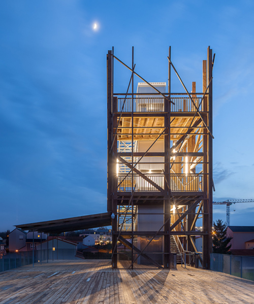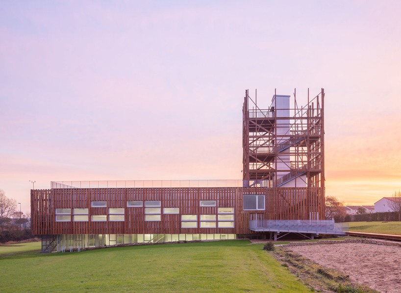 conceived as an exposed timber structure influenced by observatories and medieval towers, berranger & vincent architectes have designed CIAP- the archaeology center located in rezé, western france. the french commune has a history dating back to the middle ages and the realization of the center has created a new symbol for the city. its traditional yet contemporary form features a light wooded cladding which wraps around a glass volume which hosts a multi-functional space. the timber extends upwards to produce a lookout tower for visitors.