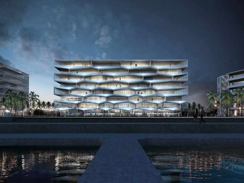 the façade’s hexagonal pattern frames views across the island, while balconies not only offer external recreational space, but also provide summer kitchens and pools overlooking the marina. at ground level the patterned elevation merges into the square, establishing a continuous and subtle topography. the hexagonal forms are continued throughout the landscaping which includes green mounds, palm trees and seating. a shallow pond is formed at the center of the plaza and is fed by fountains and creeks scattered across the open expanse.