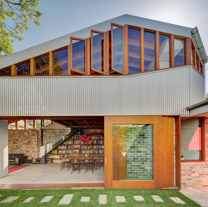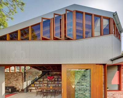 carterwilliamson updates an abandoned livestock shelter, transforming it into ‘cowshed house’, a single family home in glebe, a suburb of sydney, australia. the brick walled structure defines the edge along the urban street, enclosing a private courtyard in the northern part of the site. although the building was structurally unsound, the existing materials were left in place where possible and reused throughout the project, thereby minimizing waste. in keeping with its agrarian tectonics, large timber beams used to support the upper floor were left exposed, windows and doors were framed in wood, and a corrugated metal skin finished the upper floor. these simple, robust materials speak to the project’s environmental and economic sustainability. the height at the corner pronounces the dwelling’s presence in the gentrifying neighborhood. its prominent silhouette also serves to prevent leaves from the nearby jacaranda tree in the yard from filling the gutter, and subsequently flooding the house. along this high roof line a clerestory band lets light and air enter the house, while their height assures privacy. inside, the living room, kitchen, and dining area are all open to one another and to the courtyard, which is separated by a large tri-part sliding glass door. the children’s bedrooms, furnished with hammocks, enclose the property to the southeast, forming an L-shaped plan. the master bedroom suite occupies the upper floor above the kitchen.