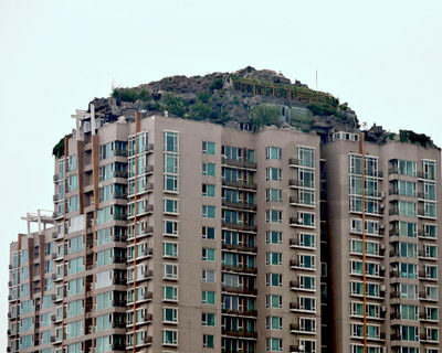 zhang biqing, a doctor of traditional medicine and owner of a successful chain of acupuncture clinics, has spent the past six years building a mountaintop villa– albeit on a bejing hi-rise rooftop. the illegal penthouse, while striking with its shrub-filled, bucolic-looking rocky expanse, has quickly become a symbol of systemic disregard for authority and regulation in contemporary chinese building culture. the sprawling synthetic landscape is essentially a private mountain peak embedded with a luxury villa and adds an extra two storeys to the 26 level building. the high-end residential compound in beijing’s haidan district, aptly dubbed park view, is conspicuously topped by the rocky terrain, winding walkways and garden trellises. the unabashed complex of staggered rooms has been subject to years of complaints by neighbors, but only recently have authorities deemed 1000 square meter mansion prime for demolition. the owner, a successful director of a traditional chinese medicine practice and former member of the district’s political advisory board, has 15 days to demolish the 15 million yuan (over 2.4 million USD) structure or provide incontrovertible proof that it is safe and structurally sound.