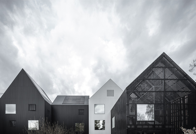 internally, rooms of various sizes and types have been created for the occupants as a result of the 11 offset volumes. the structure consists of two to three storeys with group rooms that have individual access to the outdoor space on each floor. surrounded by apartment buildings, villas and small gardens, the kindergarten adapts to the different scales of the local community and reflects the varied nature of the neighboring pitched roofs.