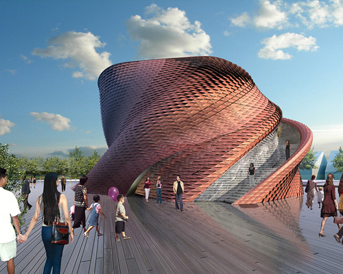 vanke, china’s leading multinational real estate company, has revealed images of its pavilion for the expo milan 2015. designed by architect daniel libeskind, the structure takes a twisting motion to create a fluid circulation from the exterior into the exhibit area. the project’s shape is informed by a variety of diverse cultural influences, including the ancient thinking of confucius and lao tzu, the renaissance, as well as contemporary art. a sinuous volume results, wrapped in a scale-like skin. an external staircase provides access to a rooftop terrace, offering views of the surrounding expo park.