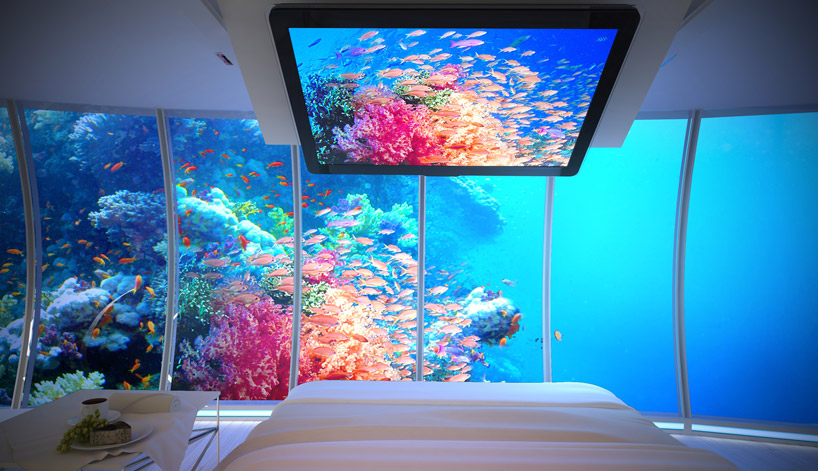 the submerged resort is located up to 10m beneath the surface of the sea, is approximately 500m2 and consists of 21 rooms which can accommodate two people. each suite is integrated with the sunken world with special lighting. to ensure privacy, all rooms are sound-proof and have curtains which offer different levels of transparency. all units are adjacent to the underwater dive centre, decompression chamber and bar. to get in contact with the local flora and fauna, miniature submarine vehicles can be operated to take a closer look at the microscopic subaqueous creatures using macro photography.