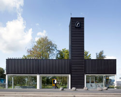 the project sits like a ring placed over the terrain, with its funnel-like roof forming a shaded perimeter walkway and an introverted core.