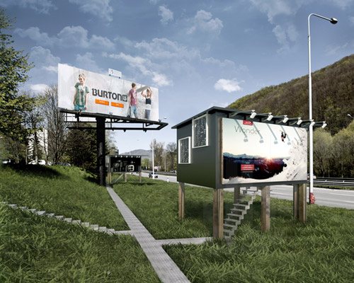 cities are engulfed with billboard advertisements which are expensive to construct, maintain and their subsequent renting is a costly venture. the proposal increases the functionality of the structures in a way that the insides could be turned into living spaces. such an object would produce minimal maintenance costs, which could be paid through the rental space of its façade. in addition, the architects believe, ‘if we take the electricity cost needed for the billboard to keep it lit during night and we try to optimize it by x%, we find that this saved energy could fully cover all those interior usage needs.’
