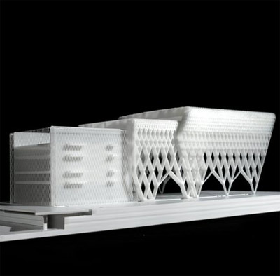 the project sits like a ring placed over the terrain, with its funnel-like roof forming a shaded perimeter walkway and an introverted core.