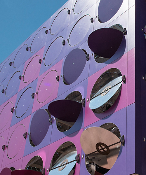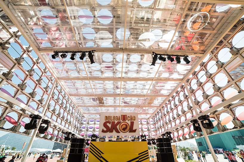 sao paulo-based architecture practice estudio guto requena was commissioned to design a pavilion for a brazilian beer brand to host music, parties, DJ’s, and shows. located in the barra olympic park, the primary location for the stadiums in the olympic games rio 2016, the building stands out due to its interactive architectural skin. the outer face of the metallic façade is composed of various colors that suggest diversity. inside, a gigantic surface of mirrors brings up the question of what it would be like to dance inside of a disco ball.