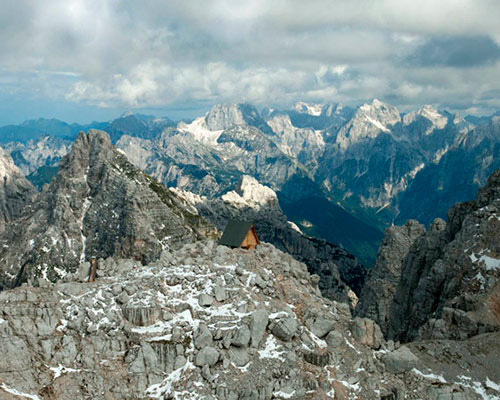 italian architect giovanni pesamosca has shared with us his unusually-sited cabin completed last summer at the crest of foronon buinz in the julian alps. the prefab modular wood structure, named in memory of the deceased climber luka vuerich, contains nine beds and is situated 2531 meters above sea level. it is strategically sited along a summit trail providing refuge to hikers, climbers, visitors, or anyone looking for a rest in the mountains. the project is built upon 6 circular concrete piers placed on the rocky landscape. spruce ‘x-lam’ panels and glulam beams were CNC milled on the ground, air lifted by helicopter, and assembled on site to create the 16 m2 refuge. all in all, the small house is made up of 30 prefab panels, 3 trusses, and a larch-wood floor structure. twelve men, professionals, volunteers, and friends of the vuerich family made the long hike up to the site to construct the shelter – it was built in only one day, and after a good night’s rest the crew awoke to stain and finish.
