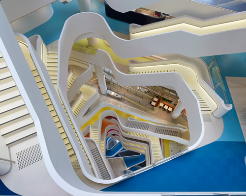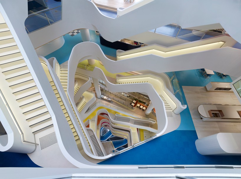 the dynamic interior of the new medibank building focuses on offering employees a health-based and activity-based working environment. located in melbourne, the company is australia’s largest health insurer where multidisciplinary practice HASSELL who collaborated with chris connell design, kerry phelan design office and russell & george were tasked to reflect medibank’s values in their vast new space. the focal architectural feature of the building is the series of staircases and ramps which wraps around connecting all the levels together. using a combination of vibrant colors as an aid, the curvilinear form of the stairways create an abstract and visually interesting view through the atrium. meanwhile, encouraging employees to adopt their own preferred working environment, there are over 26 types ranging from indoor quiet, group areas to wifi-enabled balconies where people can stand whilst working. furthermore, with a multipurpose sports grounds on the ground floor there is an adjacent edible garden with a demonstration kitchen.