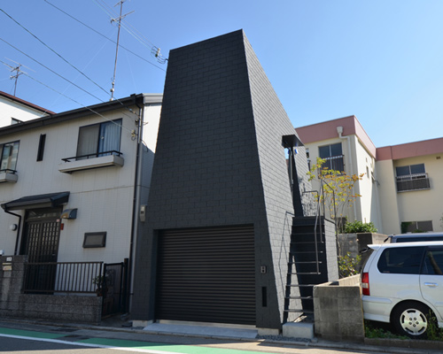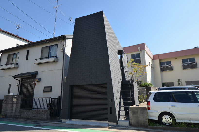 designed by japanese architects hiroki + tomoko sekiguchi, this compact wooden house is located in a residential neighborhood of hyogo, japan. defined by its gently inclined walls, the building’s roof and façades are constructed from the same material, creating a singular dense volume. the two requirements from the client were to have enough space to park a large four-wheel drive car, and not to be bothered by onlooking neighbors. in order to make room for the car, the plan was to utilized to maximize available floor space. consequently, the base of the inclined walls are situated at the very edge of the plot. a skylight illuminates the interior of the space, occupying the majority of the roof canopy.