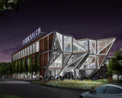 new york architecture firm HKWN has unveiled their design for the ‘pennovation center’ – a new complex dedicated to entrepreneurs and researchers at the university of pennsylvania. the center will be the first major development within the campus’ 23-acre site known as ‘pennovation works’, and will become an identifiable landmark for the school. the plan calls for the transformation of an industrial facility into a prominent focal point with a faceted northern façade that appears to burst from the existing building.