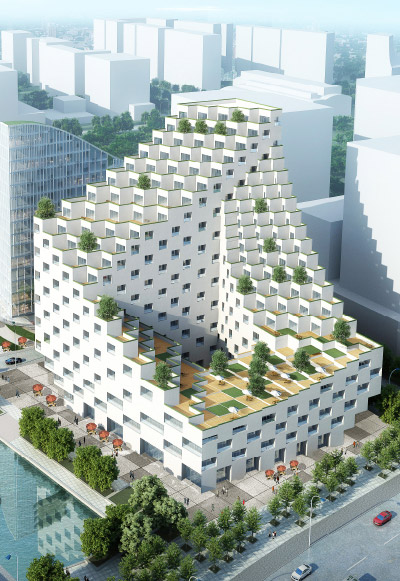 stepped terraces open views to the adjacent park and canal from each hotel room