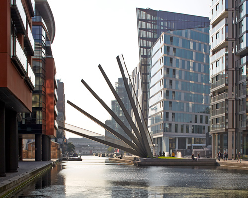the bridge forms part of the area’s regeneration, a large-scale project that involves the construction of six buildings around a waterside plaza. richard banks, the CEO of european land, the developer behind the scheme, said: bridges are a crucial element of the built environment at merchant square and, therefore, it was important for the new footbridge crossing the grand union canal to enhance the public realm, not only practically but visually. knight architects have achieved this by introducing vertical movement to the design to create a bridge that is highly visible and dramatic.’