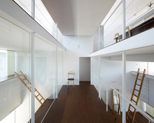 the ‘amida house’ in shizuoka, designed by japanese firm kochi architect’s studio, first began as a reformation of corbusier’s domino house system, retaining the concrete floor slab, free plan and slender columns and re-envisioning it in section. the floor planes between the three vertical zones marked by the ‘pilotis’ are shifted up and down as a ‘free section’ rather than a ‘free plan,’ offering a vertical integration of spaces. each level contains a unique function, the kitchen, bedroom, bike storage and garage, display area, guest room and rooftop terraces.