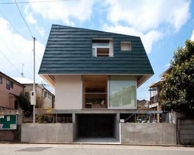 this minimalist veranda is covered by a ‘hat-like’ asymmetrical roof. the glazing on all four sides of the house provides views of the nearby parkand visually widen the occupiable space. the basement level is a carpark, in keeping with the vertical thinking that so characterizes urban living. each corner of the two story house contains a different private program, among them, storerooms, toilets, a staircase, and most remarkably a komoreru room – a space of calm in the surrounding urban streetscape.