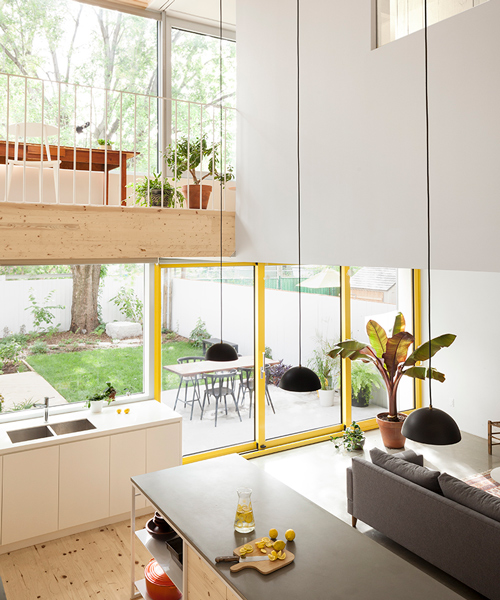 montreal-based firm la SHED architecture has completed the renovation of clark house. the inside, outside and most noticeably, the rear façade has been refurbished to show oriental cedar panels arranged in a herringbone pattern to interrupt the rigidity of the structure while adding dynamic character to garden. additionally, with the intention to bring vibrancy to the all-wood façade, the rim of the triple-sliding door has been painted in yellow to give the house a playful element.