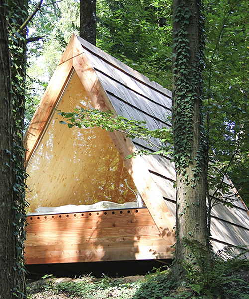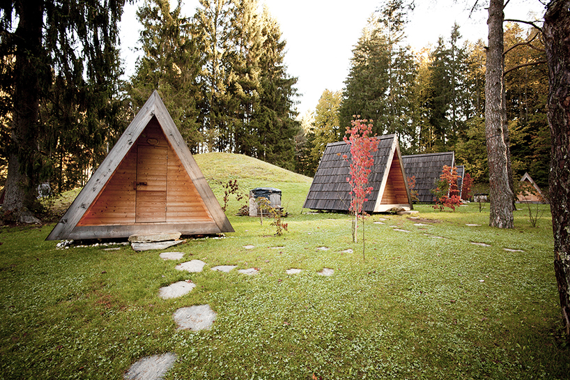 ‘lushna villas’ is a project comprised of micro-cabins, developed by the slovenia-based firm lushna that takes simplicity to its maximum expression. the smart-sized huts are reduced to those elements essential for a first row experience of nature contemplation, without compromising comfort. scaled to the human body, the units merge functionality with ecological materials. the tiny triangle rooms almost disappear in its context, being the first step to conquer the most beautiful natural environments.