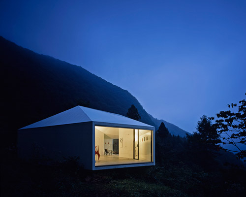 located near the town of karuizawa, a popular weekend retreat for residents of tokyo, makoto yamaguchi design has completed a villa perched on a steep forest slope. developed for a musically inclined couple, the residence also comprises a series of flexible and adaptable spaces showcasing a variety of contemporary art pieces. the structure functions as a venue for intimate music concerts and a place to entertain friends. the clients requested that no wood should be visible, with open white volumes providing a suitable backdrop for the collection. the gallery offers views across the japanese landscape, while kitchen and washroom facilities are built into the concrete floor.