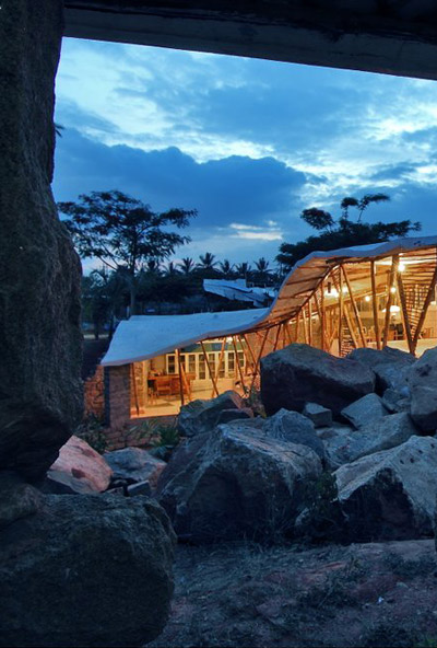 the project sits like a ring placed over the terrain, with its funnel-like roof forming a shaded perimeter walkway and an introverted core.