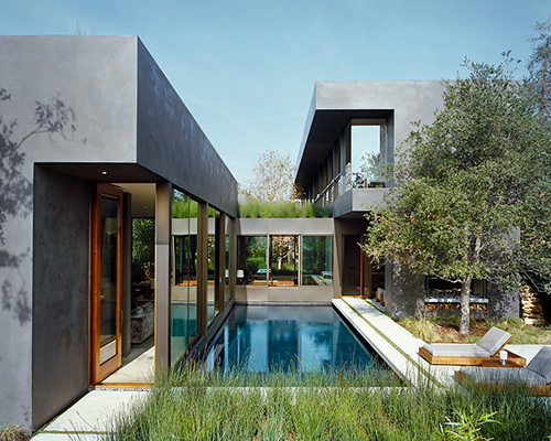 the vienna way residence by local practice marmol radziner associates is located on a lush narrow site in venice, california. due to the slender nature of the plot, the house was divided into thirds with the two main volumes pushed to the opposing property lines bridged by a sunken kitchen and a swimming pool. the single-story southern mass contains more formal living and dining areas that extend out onto an exterior patio. the northern half by contrast is composed of more casual bedrooms, living room, and office in a two-story structure that also contains its own exterior courtyard. the kitchen, enclosed by full-height glass panels on either side connects the two as the anchor, controlling the flow of circulation through it and views at its transverse axis. on the kitchen’s rooftop, a garden continues the dense greenery in the negative spaces of the yard. extensive glass panels allow the user to live within the sycamore and oak trees and buffalo grass.
