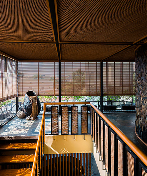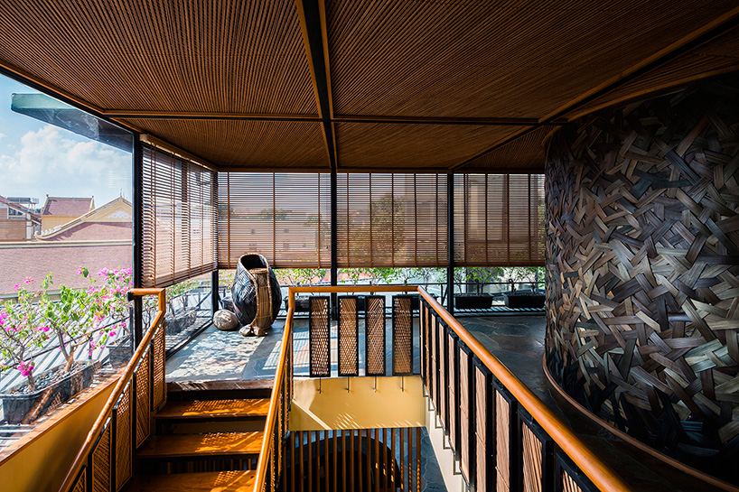together, the internal walls establish a diversity of spaces and add a sense of softness and comfort to the atmosphere. triangular areas where curved elements meet became known as ‘light tubes’. these distinct forms, spaced intermittently throughout, are hand-knitted with bamboo much akin to traditional vietnamese lamps. the technique has other applications within ‘kimono’ as well, including amongst others, doors, some partitions, and the stairwell. dining rooms are understated, allowing quality handiwork and excellent food to provide a refined eating experience in the depths of ha noi.