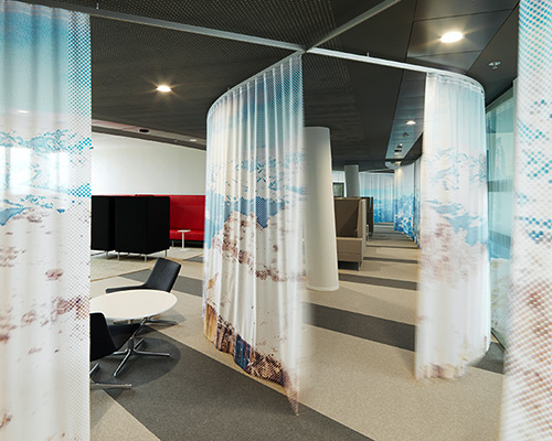 resulting from these ideas is a visibly defined, no-questions-asked interior with zones created specifically by task. spatial separation is covered by the headquarter’s main feature, a 3.6 km long, movable partition screen that spans all 23 of the building’s floors. printed on the translucent walls is a voyage that takes guests and employees on a virtual trip through austria’s countless landscapes. while moving from one floor to the next, viewers experience points of acceleration and deceleration, deepening the notion that they themselves are part of the journey. all graphical compositions were created by united everything.