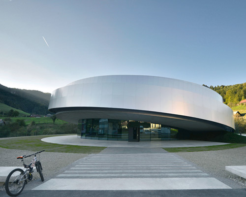 the project sits like a ring placed over the terrain, with its funnel-like roof forming a shaded perimeter walkway and an introverted core.