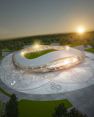 slovenian firm OFIS architects have designed the FC bate borisov stadium in belarus, which is due to be  onsite in early november. its opening is planned for 2012, when the city of borisov celebrates a significant anniversary. distribution of the program takes into account the natural advantages of location and existing interventions in the terrain and the fact that the stadium has 13,000 seats, has to obtain 4 stars according to UEFA categorization and have additional 3,000 square meters of public program. the stadium with external arrangements has to provide quality traffic organization and controlled / separate access during the match and in everyday use. the position also maintains the most of existing trees on the site.