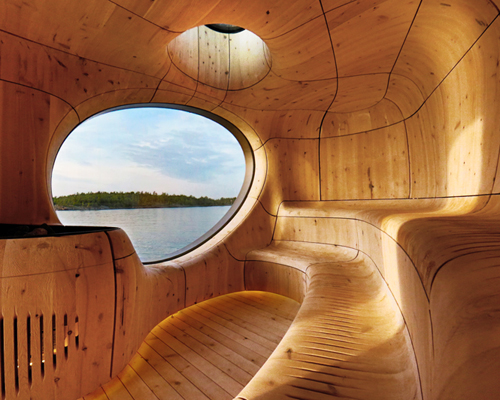 perched on a private island, north of the canadian city of toronto, this sculpted sauna was constructed using three-dimensional technology to scan, model and build the scheme. designed by local studio partisans, the realized project was the result of comprehensive research informed by the imagining of the space as a ‘grotto’ – a cave-like volume often found near water.