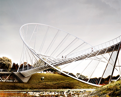 changing its appearance depending on the angle of approach, this proposal for the meadows salford bridge competition by designers alex daxböck and chris precht of penda features a strong elliptical shape. the project offers a dominant visual landmark that when viewed from its side looks like a regular suspended bridge, but as one gets closer the structure opens up to a rounded volume, engulfing pedestrians as they cross over to the meadows. the multifaceted object is in contrast to its surrounding harmonious green spaces. the crossing is presented as a disco-like object when viewed from the south and north, whereas from the western and eastern sides it looks slim and elegant, almost two-dimensional. constructed using a truss system that supports a wooden pathway with glazed semi-transparent handrails with both of its endings generously widened, inviting pedestrians on its platform. the walkway merges onto a terraced landscape, which can be used for lounging and as an open air theater. the main structural element is made using a welded steel tube that rests on two concrete bearings, supporting and carrying the weight at the same time. during the day the suspension cables reflect the sunlight, while the sun’s energy is stored in energy saving LED’s, allowing the bridge to glow during the night.