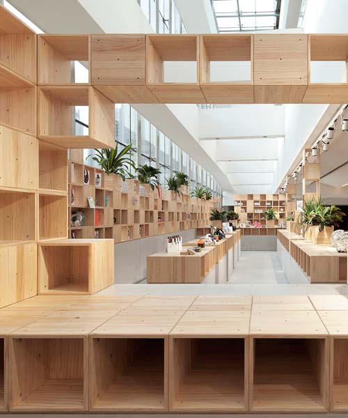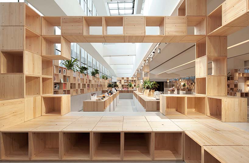 architecture studio penda has designed a retail outlet for wakaka, a chinese mobile app developer, formed from carefully arranged wooden boxes. the team was commissioned to conceive a temporary store to display the client’s gadgets and advertise its apps. this brief resulted in a design which bridged virtual and physical worlds, connecting visitors to their online store.