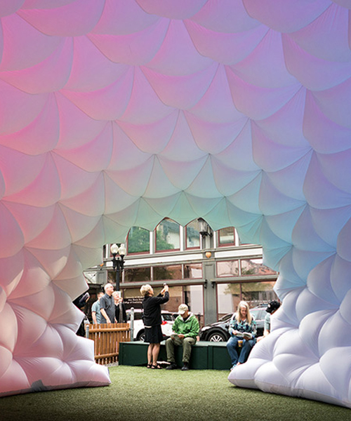 on the façade of the structure red, blue, and green fabric panels can be seen on the exterior membrane, which filter through to produce subtle color gradients on the white surface inside. pneuhaus’ concept for the installation builds upon the scientific reproduction of color within the environment which works by reflecting light off visible surfaces.
