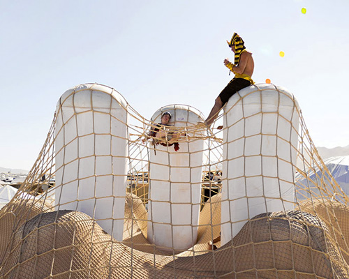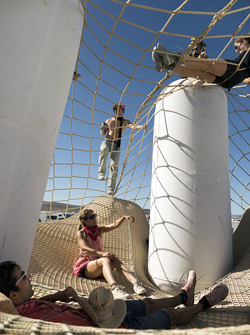 ‘playascape’ is a two-tired climbing structure created by north providence, RI-based design collective pneuhaus in collaboration with joe gebbia (co-founder of airbnb) and textile designer carmel snow. the form is made by tensioned netting spread over a series of air-inflated columns. the flexibility of the various forms facilitates interaction between architecture and people that rigid systems cannot. the entirety of ‘playascape’ shifts under the weight of each climber, allowing for implied connections between individuals — it is burning man, after all.