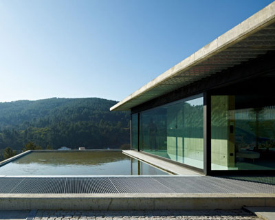the project sits like a ring placed over the terrain, with its funnel-like roof forming a shaded perimeter walkway and an introverted core.