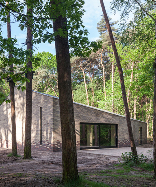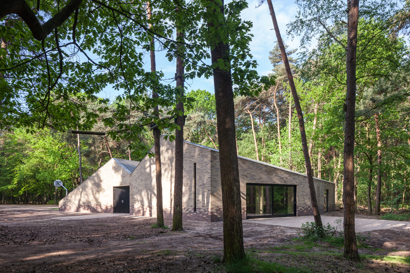 dutch studio reset architecture has recently completed a multipurpose theatre pavilion in the woods of ‘zonnewende group stay’. the domain of ‘zonnewende’ is part of a natural reserve, located in the netherlands, where once can find dense woods combined with open spaces for sports and play. typically, barracks are used in the woods for theater, musical performances and many other activities. today, a 220 sq.m derelict barrack has been replaced with a 430 sq.m pavilion characterized by a vast hall of 200-seats.