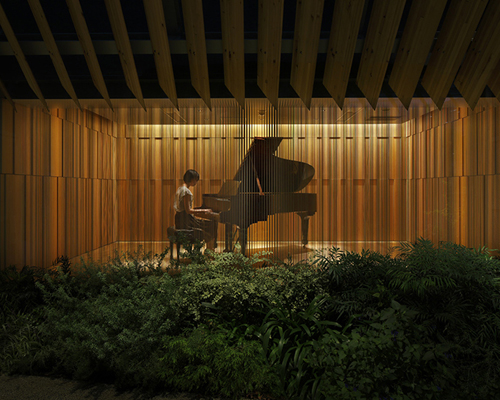 designed by ogata yoshiki, ikawa atsushi, and watase ikuma, the steinway & sons flagship asian store is located in tennoz isle in tokyo. the aim was to create a space where their clients can feel the craftsmanship of the brand, its philosophy, history, and the beauty of their instruments. the first step was to annex a string screen to the façade to represent the echo of steinway. to do so, 12.000 stainless wires were added, echoing the number found in the pianos. in the same way that the piano wires receive tension, which cannot be seen with the human eye, the stainless wires on the façade give the space both tranquility and a tense atmosphere.
