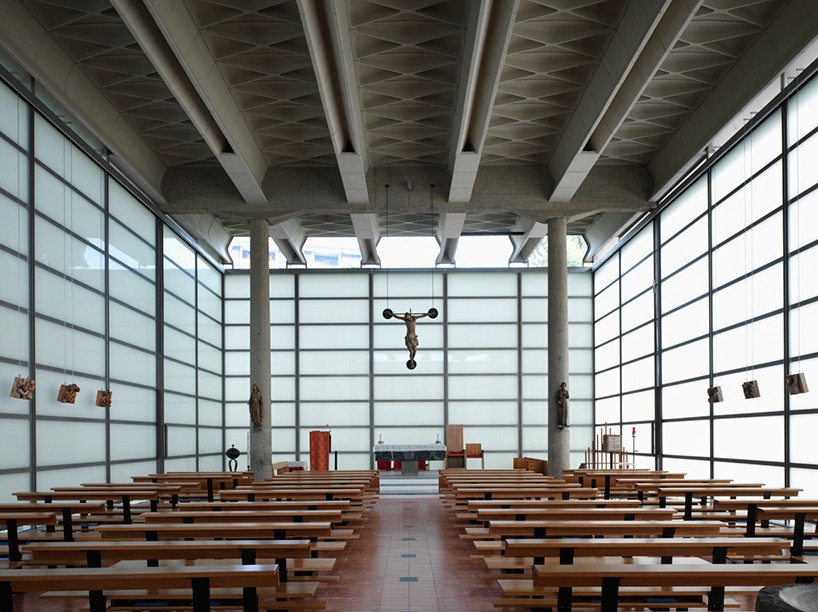 completed in 1958 by by angelo mangiarotti, bruno morassutti and aldo favini, ‘chiesa di nostra signora della misericordia’ (our lady of mercy church) has long been considered a small masterpiece of modern italian architecture. located in baranzate, a town north-west of milan, the building features a distinctive glazed exterior, and is characterized by its typology pioneering use of cement and steel.