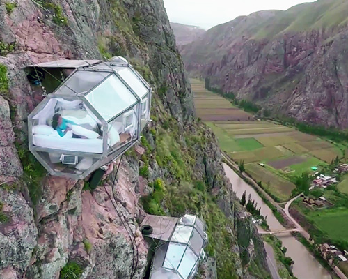 hanging from a sheer cliff face in peru’s sacred valley of cuzco, three transparent capsules have been installed, providing accommodation for particularly intrepid guests. to reach the sleeping pods, lodgers must first climb 400 feet (122 meters), or hike an challenging trail using ziplines before enjoying the impressive views of the mystical valley.‬ ‪