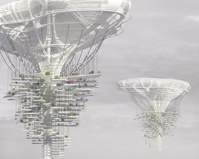 while the first place winner of eVolo‘s 2013 skyscraper competition posited buoyant umbrellas as a restorative measure for the polar ice caps, the second and third place entries proposed significant ideas to local climate issues. the third place proposal addressed the rapid and exponential population growth of beijing with a building that floats above land and frees the crowded city’s groundplane. this ‘light park’ stays afloat using a capped helium balloon at its zenith and solar powered propellers along a central axis. these platforms would contain a veritable metropolitan program, complete with parks, sports fields, green houses and restaurants. bound by steel cables, the blades are directed to balance the floating form. designers sought to ‘mitigate the pollution that comes with increased development’ by creating high-performance architecture– a building that is a filter, cleanser and liberator.