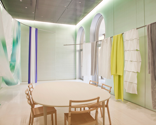 during milan design week 2014, designboom had the chance to interview japanese architect toyo ito, where he spoke on the design of the first kinnasand flagship store in milan, for the innovative curtain textile and carpet producer. situated inside a light-flooded courtyard in the milanese city center, the space showcases colorful textiles in captivating fashion. ‘as you can see, the textiles that are here are actually splendid; they are very delicate, and you can see that their coloring is really attractive and appealing,’ ito tells designboom. ‘so, when I decided to approach the architecture for this very place, I decided that I needed something that would not overwhelm the quality and the beauty of all these fabrics.’