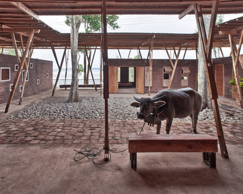 the project sits like a ring placed over the terrain, with its funnel-like roof forming a shaded perimeter walkway and an introverted core.