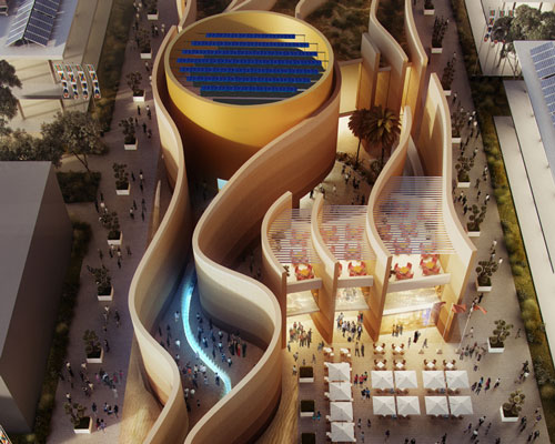 the project, which will be located close to the center of the expo, will be accessed from the site’s main circulation axis – the ‘decumanus’. from this entrance point, visitors are enticed inside the pavilion between two twelve meter walls, forming a canyon-like opening. envisaged as a series of parallel weaves, the curved and undulating partitions call to mind the ridges and texture of sand dunes, while also controlling solar access – a more pressing concern once the structure is transported to the UAE. reflecting time-honored planning methods, internal pathways echo the narrow pedestrian streets and courtyards associated with desert towns and villages.