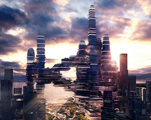 urban future organization (UFO) and CR-design have worked alongside a small team of computing and regenerative design experts from sweden’s chalmers technical university to envision the shenzhen bay super city. the collaboration has resulted in ‘cloud citizen’, a project that has been awarded the highest prize in the skyscraper competition. the proposal calls for a green, hyper dense, three-dimensional community in a plot of land across from hong kong. according to the architects, ‘cloud citizen is as much a strategy for how to build future cities capable of giving back more to the environment than they cost, as it is a singular iconographic mega building complex with an identifiable and striking skyline giving character and hope to the vision of a greener future enabled by human enterprise.’