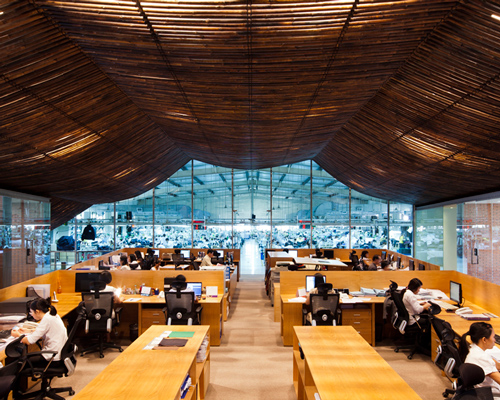 local materials are used throughout with exposed brick and bamboo utilized to convey a sense of local identity and an environmental consciousness. the pliable bamboo ceiling, which conceals mechanical equipment and lighting fixtures, hovers above the administrative offices simulating a textile surface. externally, wires are attached to façade, with a degree of greenery provoking a stark contrast against the underlying steel structure of the factory.